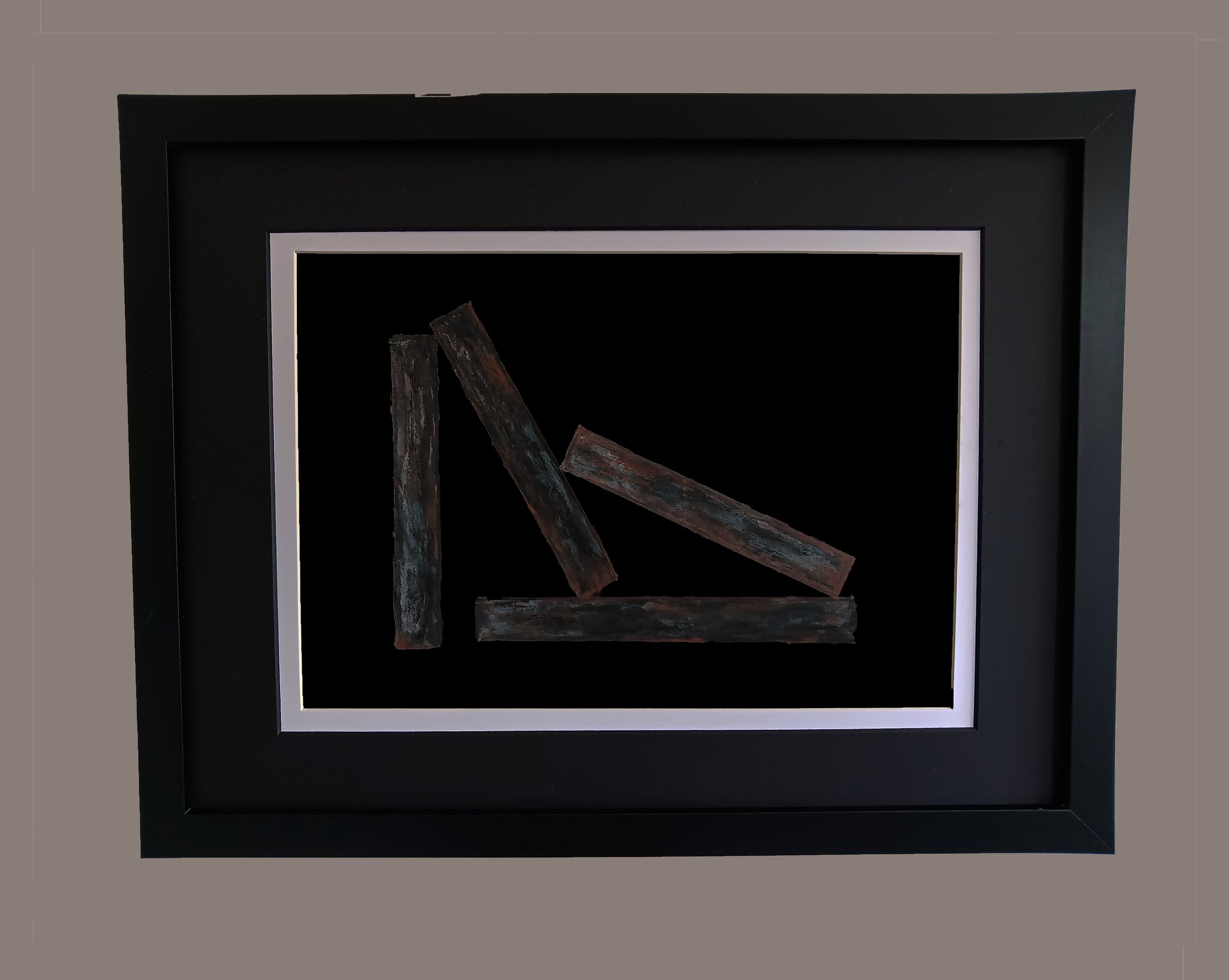 Abstract painting on black Xuan paper, using chinese pure pigment paints in matt black wooden frame. A sombre reflection.